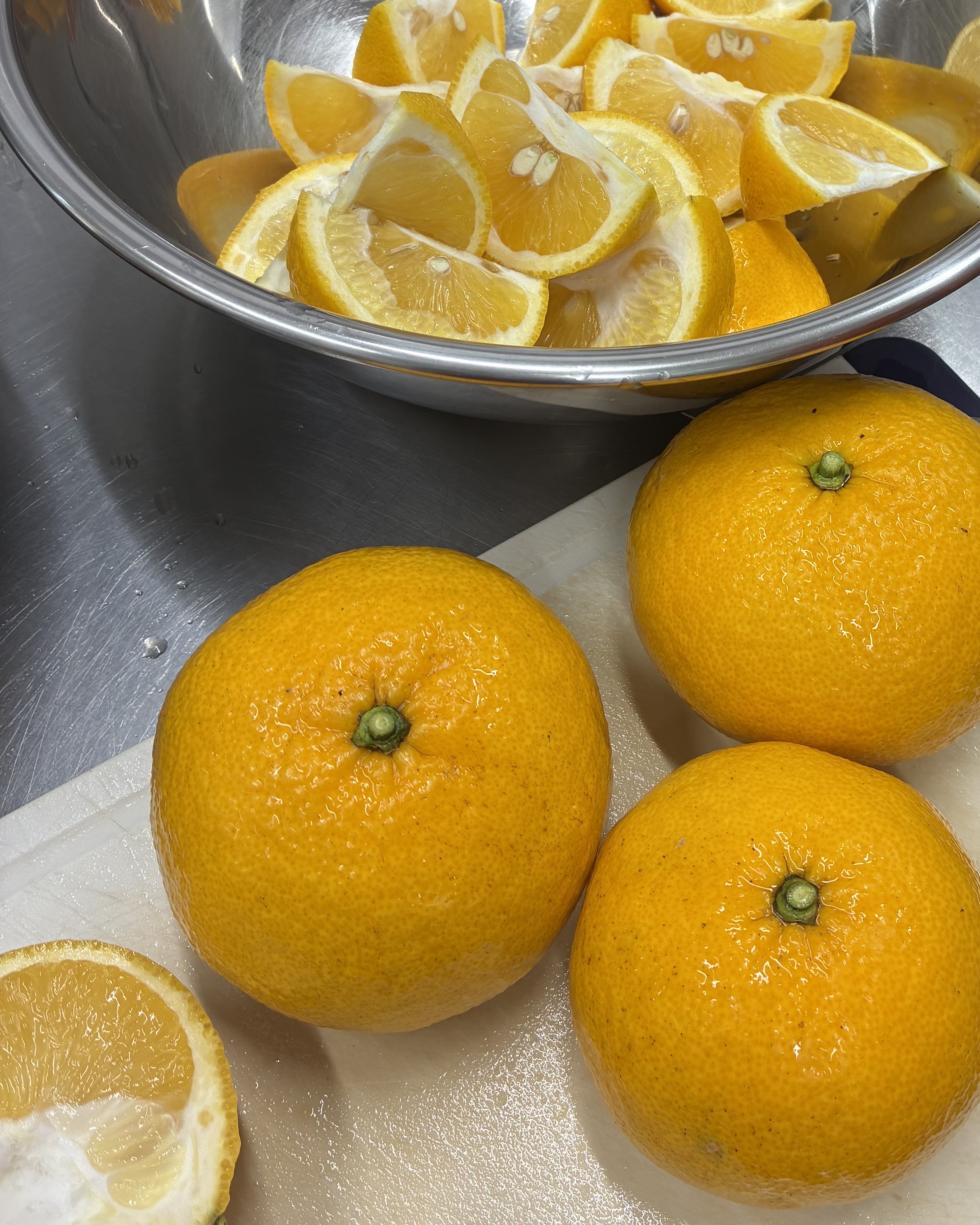 季節ごとにオリジナルのシフォンケーキを焼いています。その季節の果物も手作業で、一つ一つ丁寧に洗浄し、ペクチンは使わず3日間かけてコンフィチュールに仕上げます。夏みかんなどは、皮、実、種全て使います。